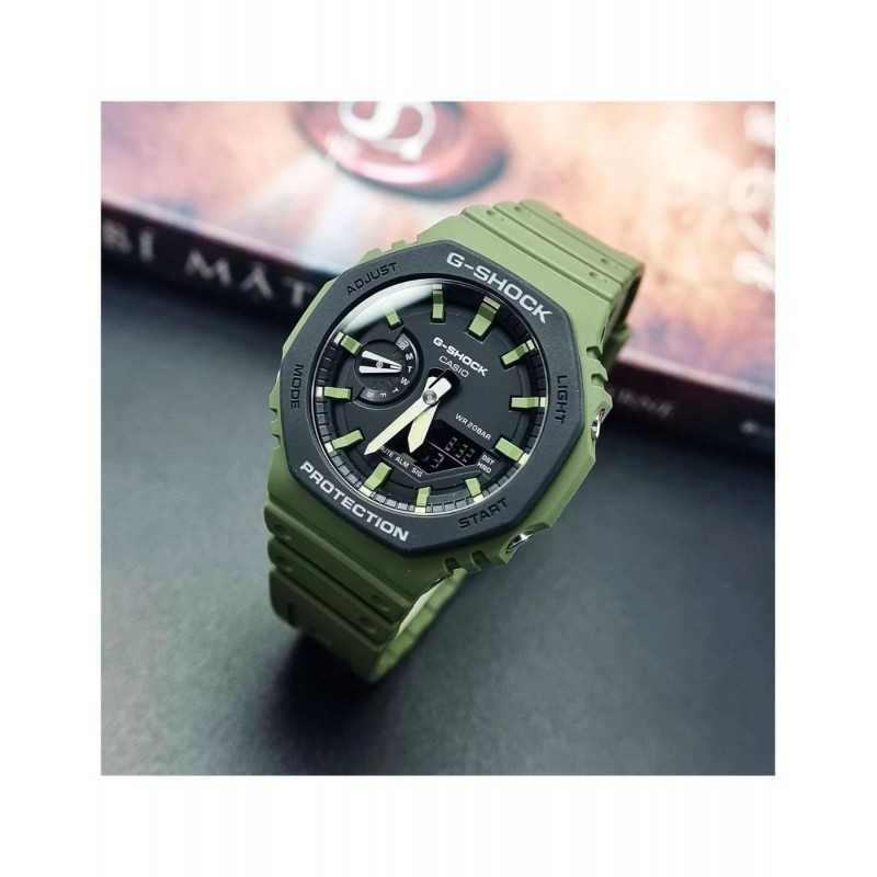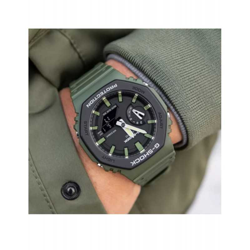 Dos modos de visualización de la hora (analógico y digital) en un dial de 33 mm. Brazalete de resina con acabado OD GREEN, resistente y duradero, para llevar cerca de la muñeca, caja con dimensiones de 48.5 × 45.4 × 11.8 mm.