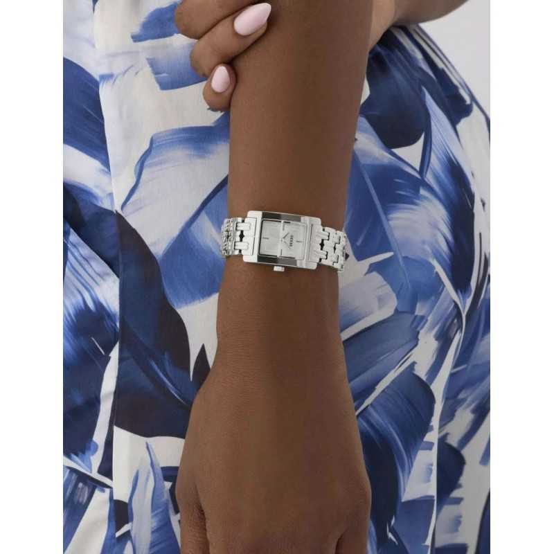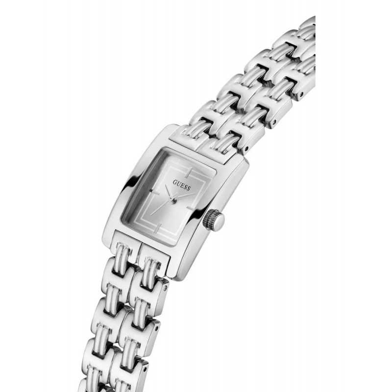Reloj de mujer Guess con caja de acero reciclado, movimiento de 3 agujas y esfera en color plata.